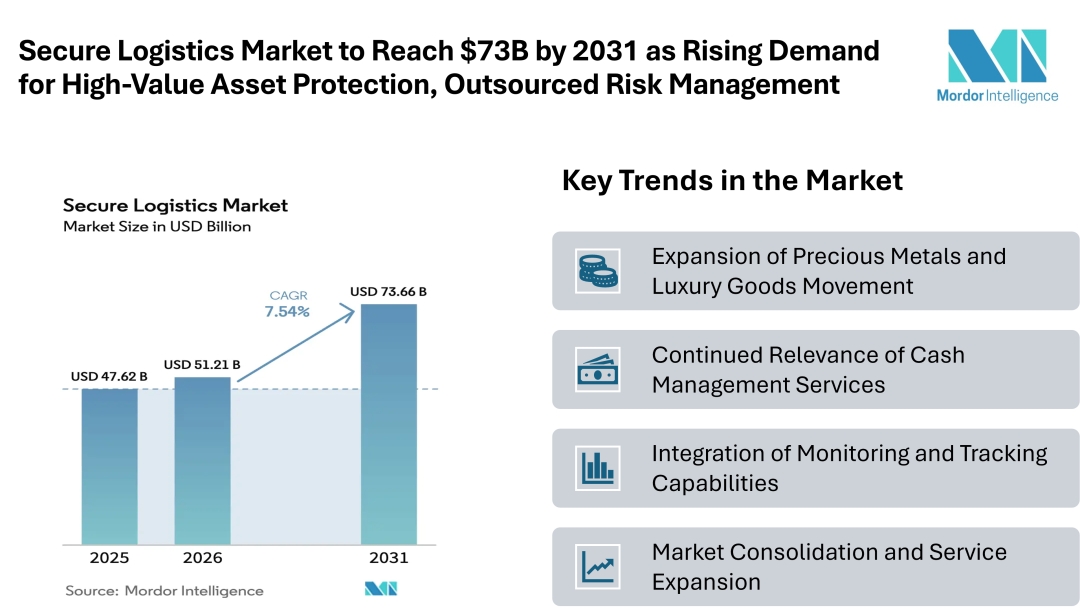 According to industry analysis, the Secure logistics market size was valued at USD 47.62 billion in 2025 and is estimated to grow to USD 51.21 billion in 2026, reaching USD 73.66 billion by 2031 at a CAGR of 7.54% during the forecast period. This forecast reflects sustained demand for armored transportation, secure warehousing, and advanced monitoring services across global supply chains. Despite the rapid rise of digital payments, physical currency circulation, precious metals trade, and sensitive materials handling continue to require robust protection. Financial institutions still depend on secure cash movement, while retailers, government agencies, and luxury goods companies need trusted partners for loss prevention and compliance