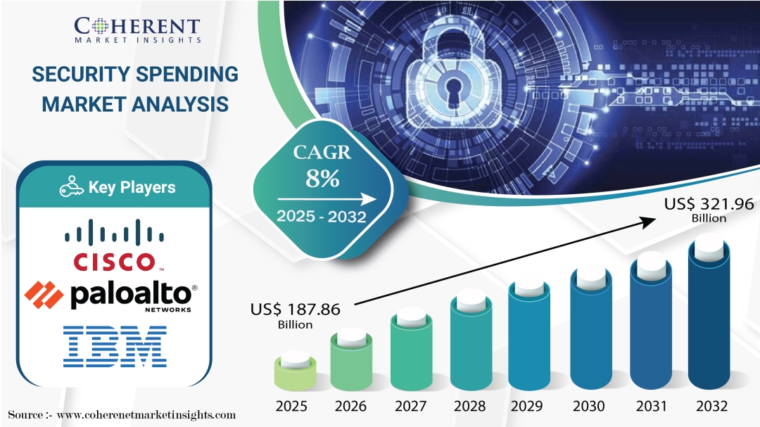 According to Coherent Market Insights (CMI), the global security spending market is poised to exhibit a CAGR of 8% during the forecast period, totaling USD 187.8 Bn in 2025 and USD 321.96 Bn by 2032.