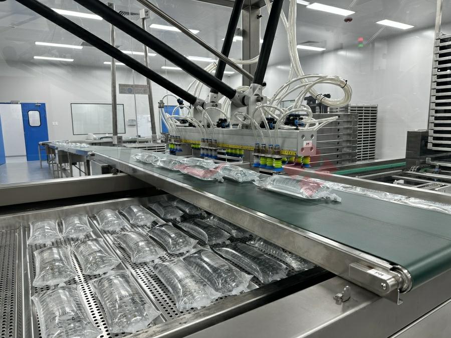 At the core of the facility is IVEN’s integrated IV solution production line. The IV bag filling line adopts fully automated printing, bag forming, filling, and sealing technologies. Following filling and sealing, an automatic terminal sterilization system is used, where robots handle the automatic loading and unloading of IV bags onto sterilization trays. These trays move automatically in and out of the autoclave, creating a seamless and controlled sterilization process.