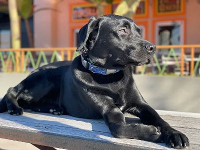 A sleek, black Labrador-mix dog lies calmly on a weathered wooden picnic table in an outdoor setting. The dog is facing right, looking off-camera with a focused expression while its front paws are crossed neatly. It wears a thick blue patterned collar with a metal buckle. The background features a sunlit building with orange and yellow accents and a green decorative fence, all under a clear sky.