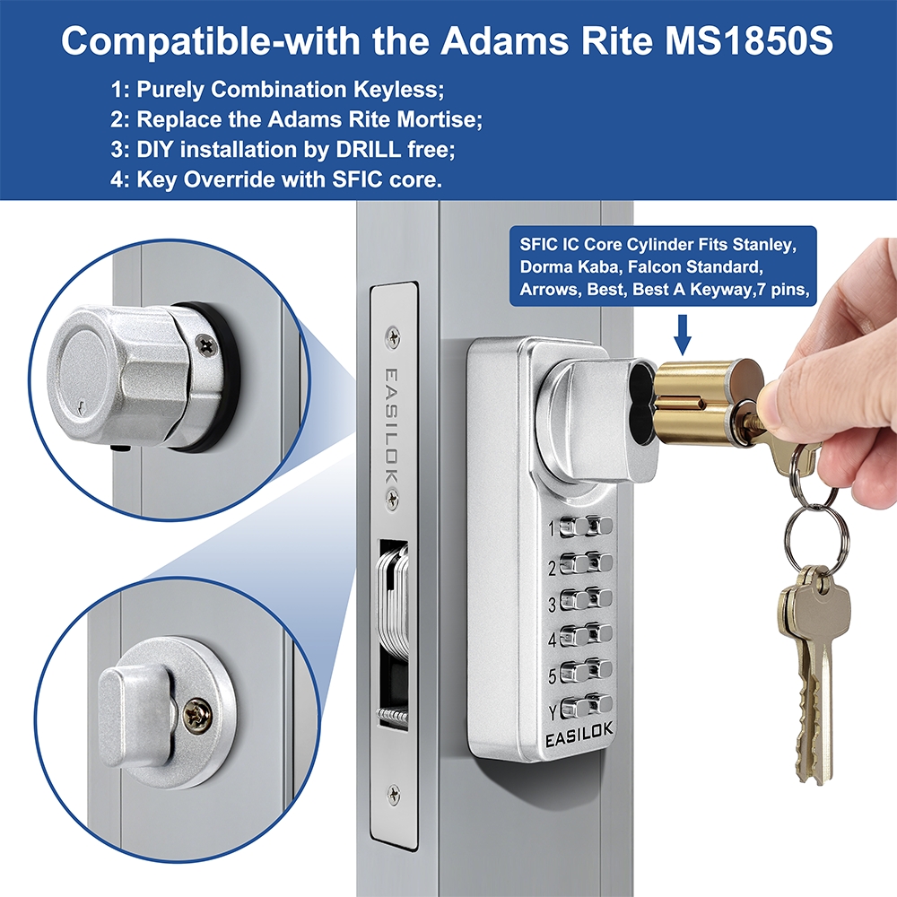 The lock combines mechanical simplicity with modern functionality, offering keypad access alongside traditional key backup. It also introduces support for SFIC cores, aligning with established commercial locking systems.