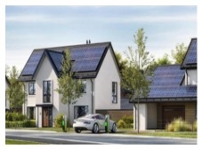 The image shows modern homes with solar panels on the roofs, featuring electric vehicle charging stations in the driveway.