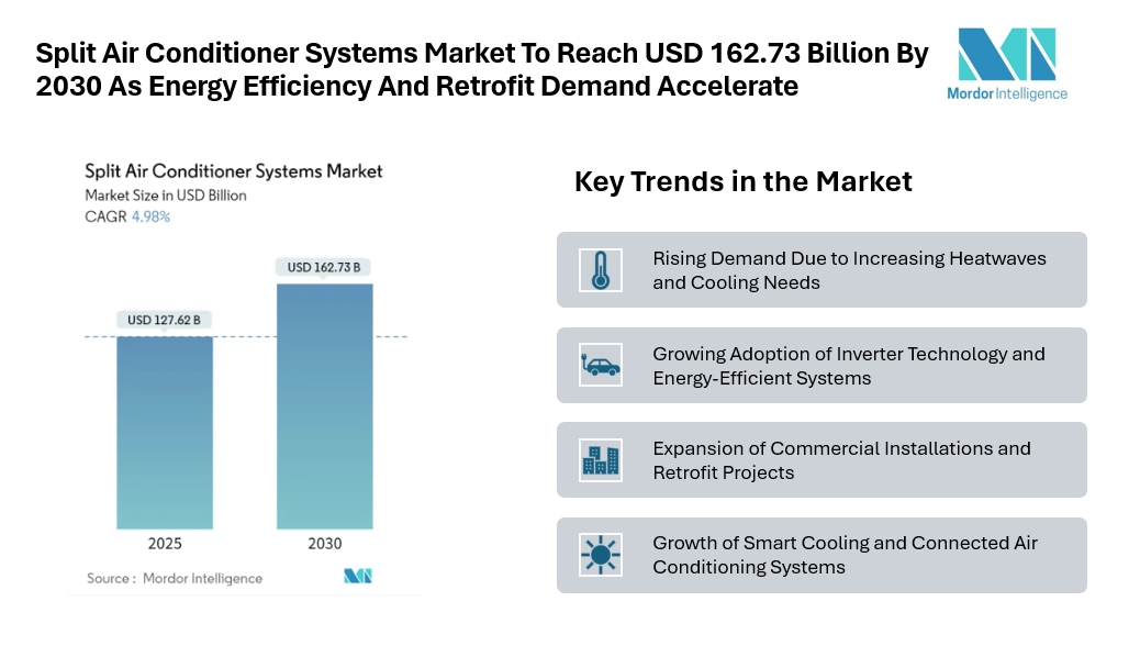According to Mordor Intelligence, the split air conditioner systems market size is valued at USD 127.62 billion in 2025 and is projected to reach USD 162.73 billion by 2030, registering a compound annual growth rate of 4.98% during the forecast period. The split air conditioner systems market industry continues to expand steadily as rising cooling needs, energy efficiency regulations, and increased installation across residential and commercial spaces support consistent demand.