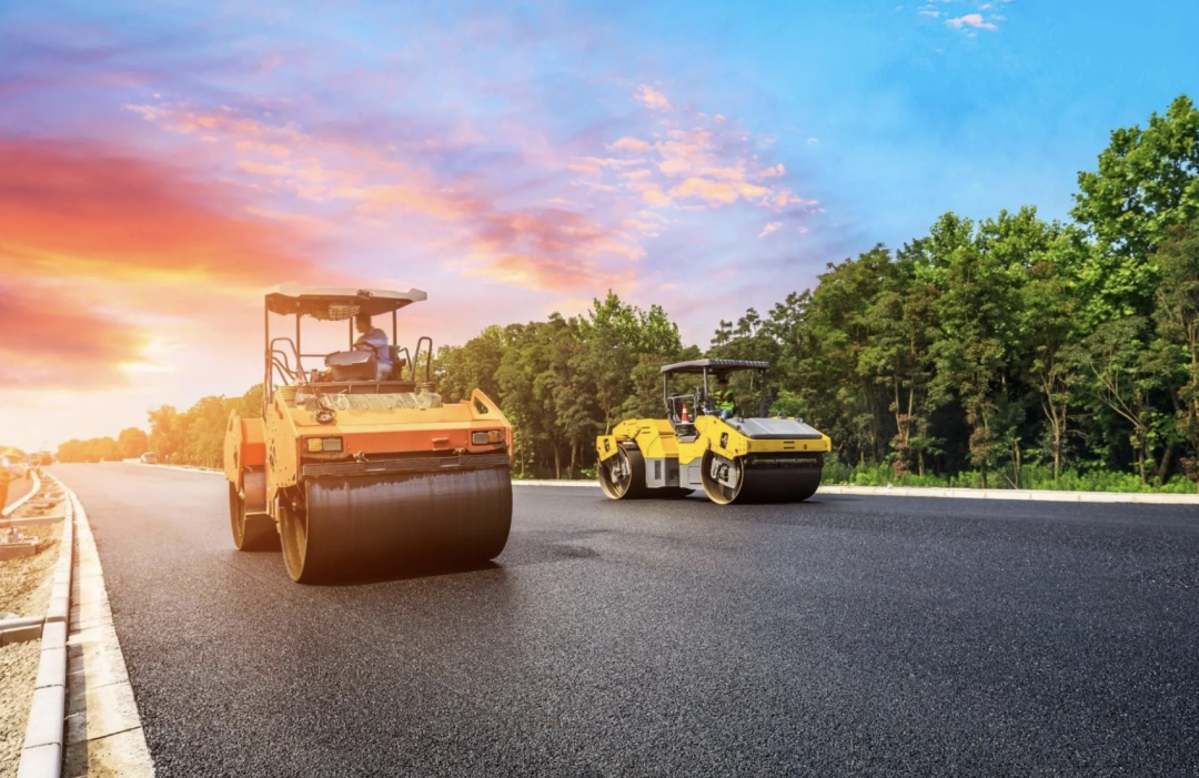 Heavy-duty asphalt rollers working on a freshly paved road, symbolizing The Asphalt Jungle’s expansion into Los Angeles with their new Lankershim Boulevard location.
