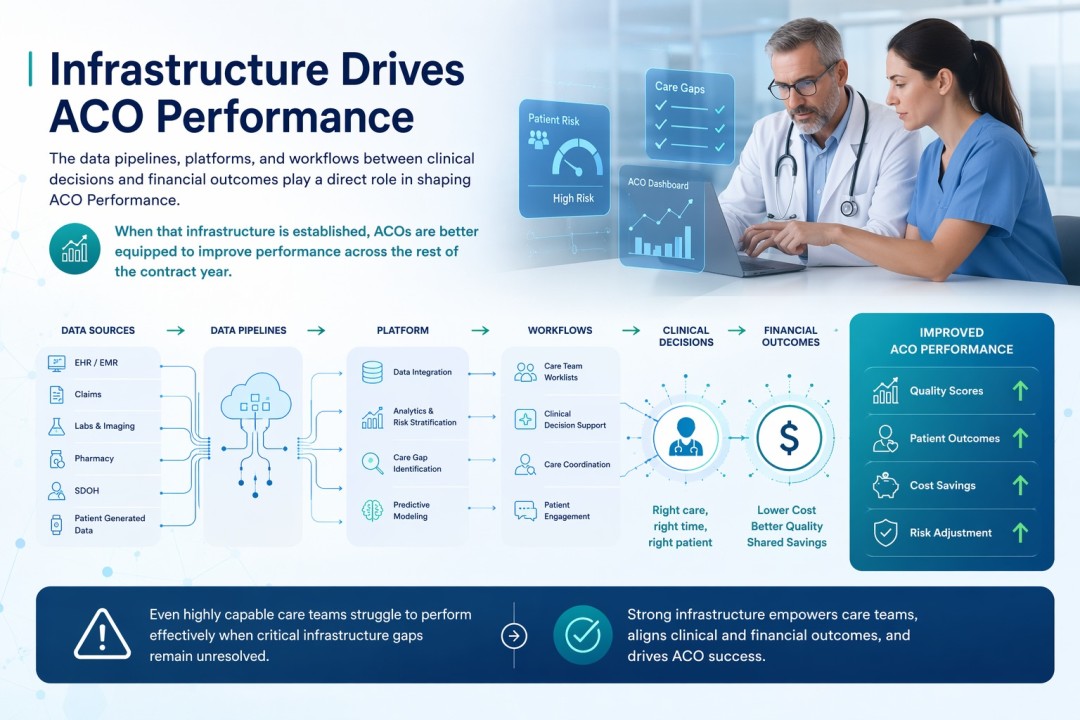 They are insufficient, as the systems these clinicians have been using have not been designed to manage the requirements of value-based care. The data pipelines, platforms, and workflows between clinical decisions and financial outcomes play a direct role in shaping ACO Performance. When that infrastructure is established, ACOs are better equipped to improve performance across the rest of the contract year. Even highly capable care teams struggle to perform effectively when critical infrastructure gaps remain unresolved.
