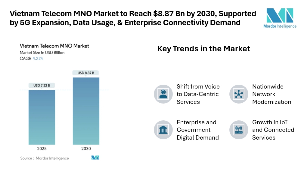 The Vietnam Telecom MNO Market continues to show steady progress as the country strengthens its digital backbone and expands mobile and broadband coverage nationwide. According to Mordor Intelligence, the Vietnam Telecom MNO Market size is estimated at USD 7.22 billion in 2025 and is forecast to reach USD 8.87 billion by 2030, reflecting consistent value growth during the forecast period. Subscriber volume is also expected to increase from 131.51 million to 157.83 million, highlighting sustained demand for mobile and data services.