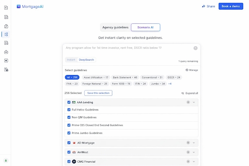 This is the “killer feature” for me. In our industry, being “mostly right” means you are wrong and getting sued or having to buy back a loan. Scenario AI provides Citations with every answer. It doesn’t just say “Yes, they qualify.” It says “Yes, per Section 3.4 of the AD Mortgage guideline,” and links to the source. This DeepSearch capability allows you to select specific guidelines to check against. You can trace the answer back to the source document. This eliminates the “Black Box” anxiety of AI. If an underwriter challenges you, you have the citation ready to defend your file.
